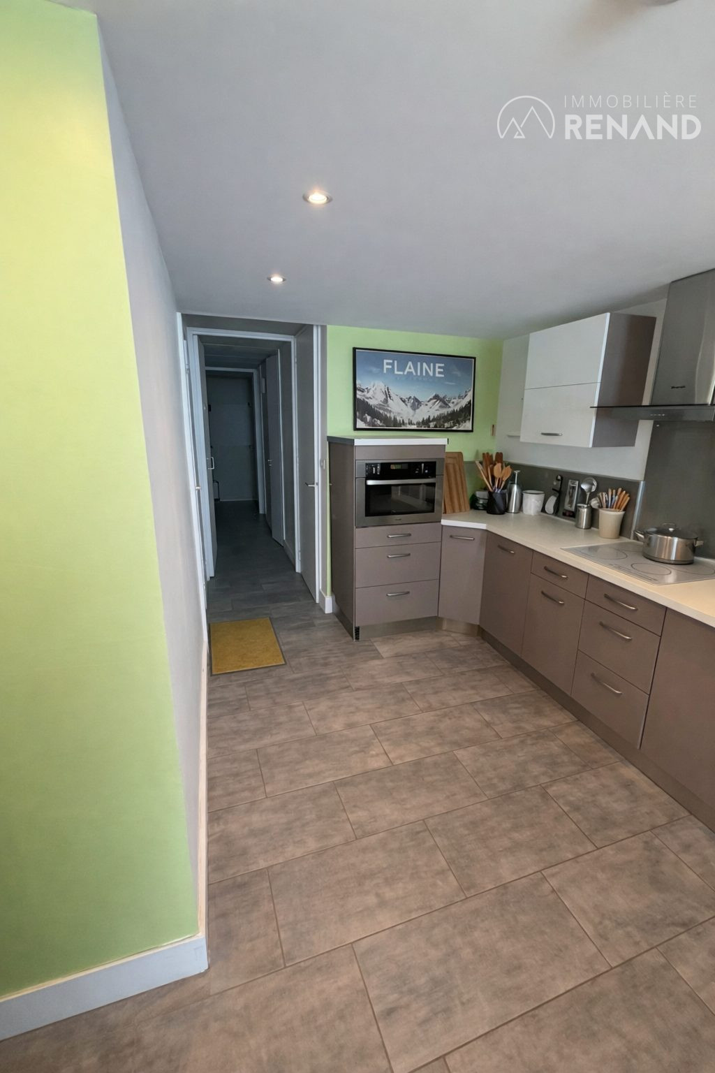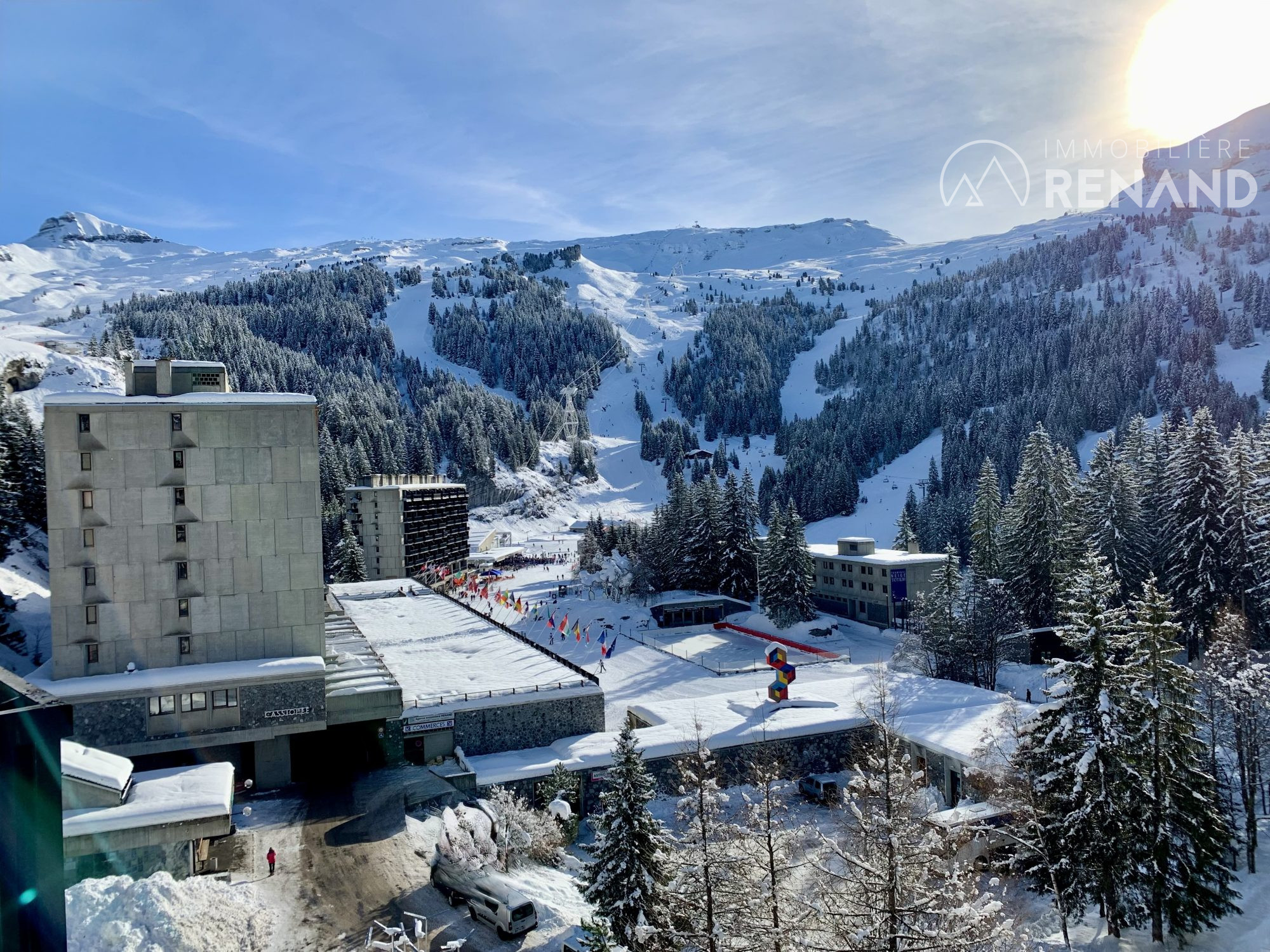 La pièce de vie, lumineuse et fonctionnelle, comprend une cuisine ouverte aménagée et équipée, un espace salle à manger ainsi qu’un salon offrant une agréable vue sur les pistes et la place du Forum.